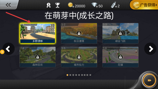 1、车库选绿色“Cheetah”车,点“播放”按钮,进“成长之路”选“乡野漂移”赛道,备竞速。