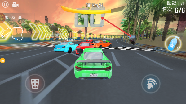 2、用虚拟按键控车,起步跟紧前车,弯道漂移攒氮气,直道加速超对手,注意圈数、名次。