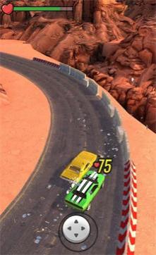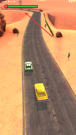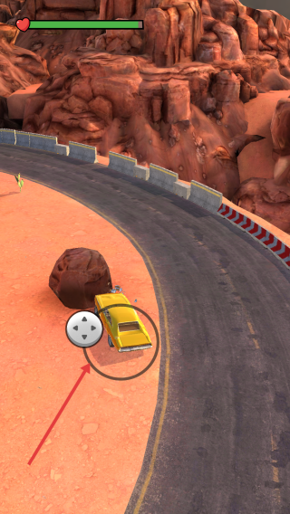 2、用虚拟摇杆控方向,在弯道减速、避岩石,直道加速撞车,注意血量(绿色条)。