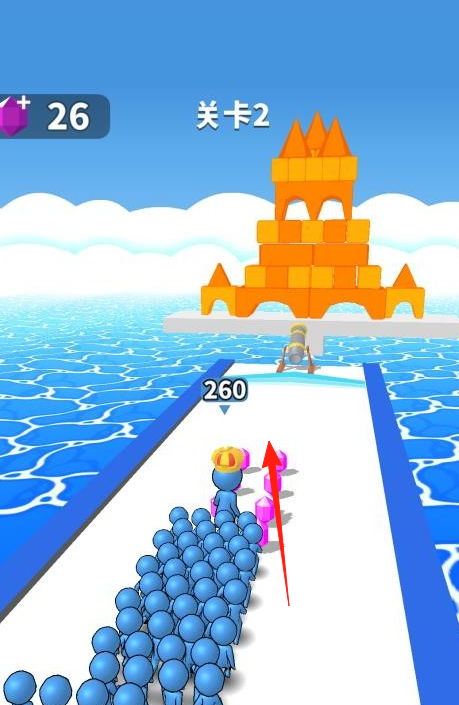 2、关卡2里,引导蓝色小人队伍收集途中【粉色钻石】,壮大队伍人数,冲击敌方城堡句号。