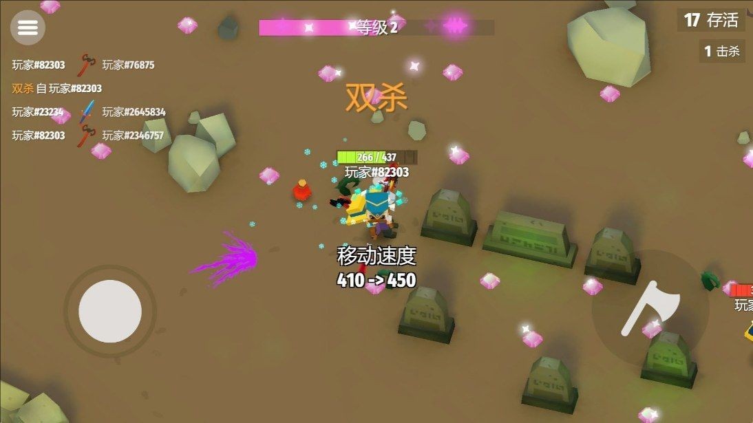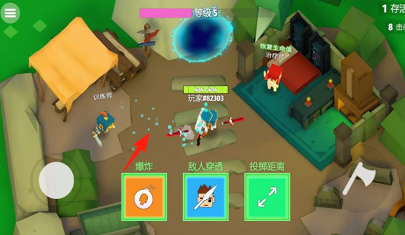 1、方块英雄的差异化技能体系:每个方块英雄都有独特技能与飞斧特性——「狂战士方块」的飞斧伤害高但射程近,技能“战斧挥击”可对近距离敌人造成范围伤害。