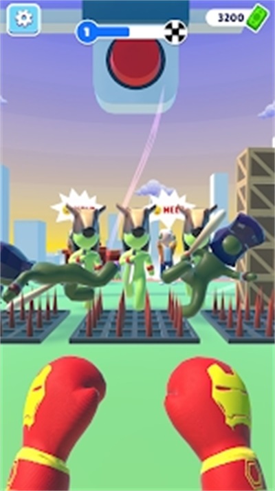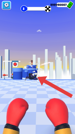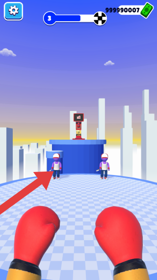 1、玩家以第一视角戴红拳击手套,攻击远处敌人,界面有金币数(999990007)、进度条(显示数字3)及设置等图标,背景是城市建筑风格场景。