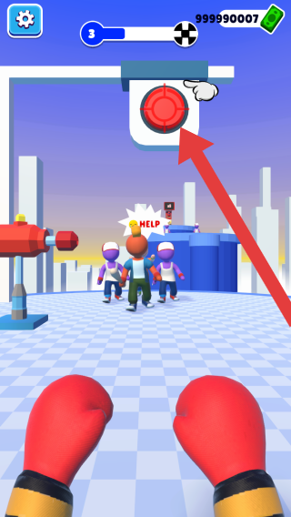 2、玩家以第一视角戴红拳击手套,场景中有“HELP”求助标识的人物,上方有红色按钮待点击,界面显示金币数、进度条及设置图标,背景是城市建筑风格。