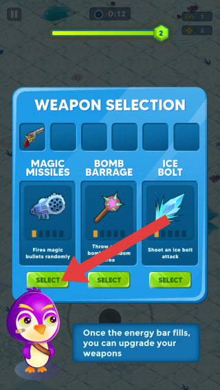 3、显示有“MAGICMISSILES”“BOMBBARRAGE”“ICEBOLT”三种武器,可点击【SELECT】选择,下方提示能量条满可升级武器,角色是紫色企鹅形象。