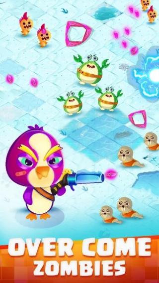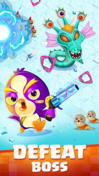 2、显示玩家操控角色在冰雪场景战斗,提示文字“你会自动攻击来袭敌人”,界面有时间、等级等信息,还有可爱的角色与敌人形象。