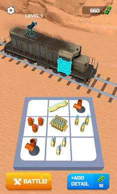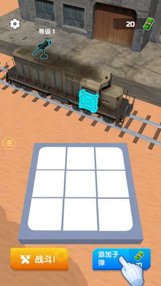 1、能看到等级1、“战斗!”按钮、“添加子弹”按钮,还有列车及相关场景元素,展现了初始界面的基础信息,玩家可在此进行添加子弹等准备,开启战斗。
