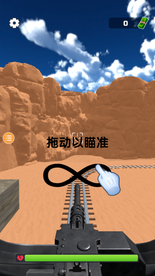 2、这是《武装列车》的画面,提示玩家通过拖动屏幕来瞄准,背景是沙漠峡谷场景,画面中还有血量条等元素。