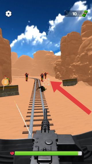 3、玩家操控列车上的机枪,背景是沙漠峡谷,有敌人出现,画面提示操作方向,右上角显示数值“10”,下方是血量条。