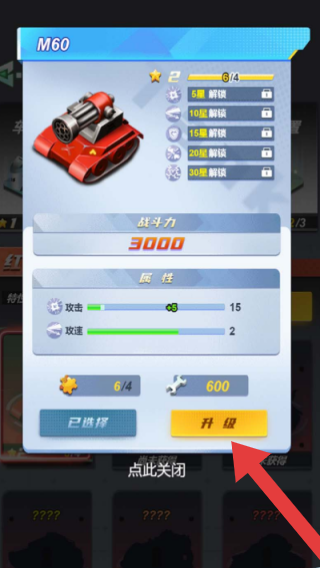 1、显示其战斗力3000,攻击15、攻速2,当前可消耗6/4(是升级材料等)和600资源进行升级,“已推荐”表明是推荐使用的坦克。