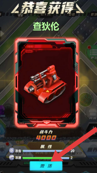 2、这是《变异机甲大乱斗》游戏中“查狄伦”坦克的获取界面,显示其战斗力4000,攻击20、攻速2,可点击【激活】按钮启用该坦克。