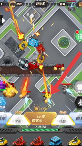 3、显示玩家在第23关,画面中有不同颜色的坦克在战斗,屏幕下方显示购买按钮,可花费10资源购买,坦克等级为3级,还有攻击、收益等功能按钮。