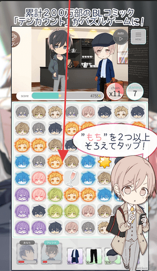1、消除玩法:在消除界面,凑齐2个以上相同“もち”角色图标消除,连击(×11)获取高分,解锁剧情、道具奖励。