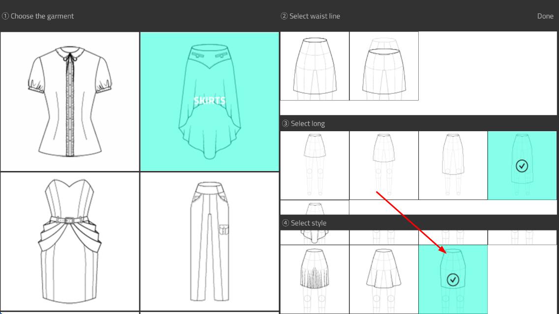 2、通过滑动屏幕调整剪裁轮廓,使用缝纫机模拟缝制流程,添加刺绣、印花等装饰元素,完成服装细节设计。