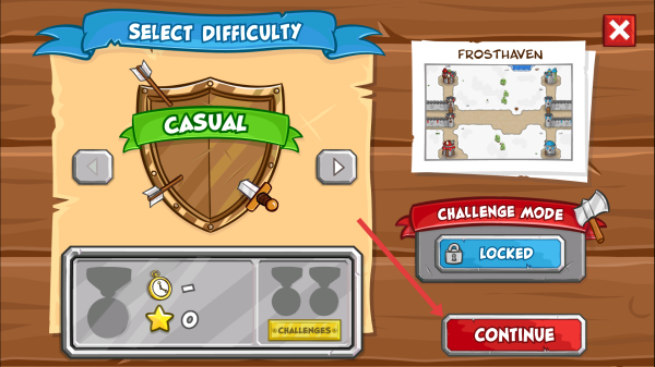 2、难度确认:选“CASUAL”(休闲)等难度,点“CONTINUE”进战斗,部署兵种守城堡。
