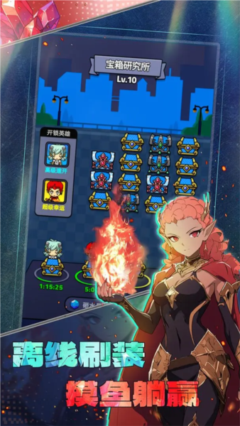 3、放置探索与养成系统:派遣英雄组成探险队,选择“深海废墟”“丛林遗迹”等地图探索,耗时越长奖励越丰厚;获取的装备可强化英雄属性。