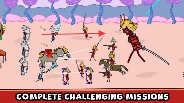 1、组建火柴人部队(弓箭手、骑兵),执行任务,挑战“COMPLETECHALLENGINGMISSIONS”,推进关卡。