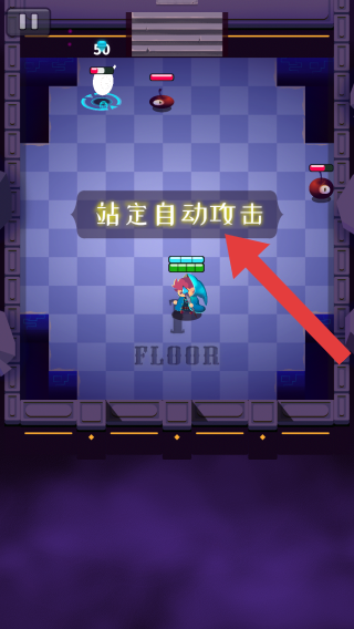2、实体信息有“站定自动攻击”的玩法提示文字,呈现出角色在“FLOOR”(楼层)场景中,上方有怪物,属于地牢战斗、自动攻击机制相关的画面。