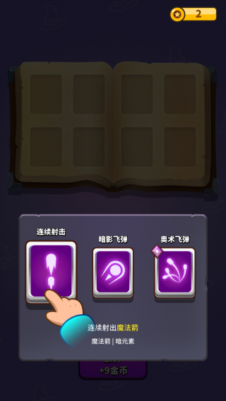 3、实体信息有“连续射击”“暗影飞弹”“奥术飞弹”三种技能,还有金币数量、“+9金币”奖励提示,呈现出玩家为角色挑选技能的环节,属于技能养成、战斗策略构建的部分。