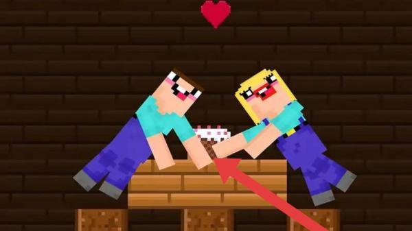 1、实体信息有像素化的角色(史蒂夫和亚历克斯形象)、蛋糕、爱心元素,展现两人争抢蛋糕的趣味场景。