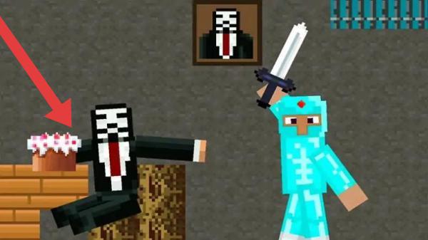 2、画面中有“瘦长鬼影(SlenderMan)”的像素化角色,还有手持剑的蓝色着装角色,以及蛋糕,背景墙上也有“瘦长鬼影”的画像。