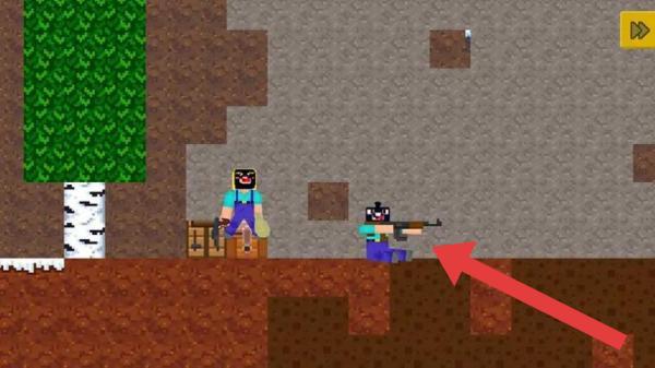 3、画面中有两个像素化角色,一个手持枪械,呈现出战斗的场景,具有《我的世界》典型的方块化、像素化美术风格。