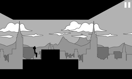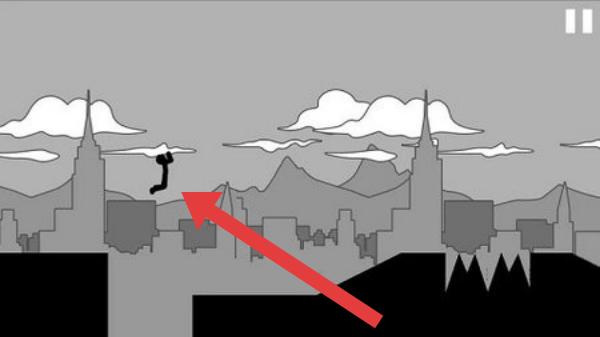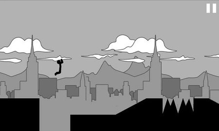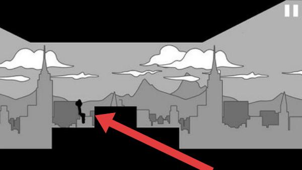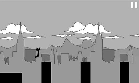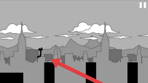 2、这是一款火柴人风格的跑酷或动作画面,画面中火柴人在城市剪影背景的场景中,正进行跳跃或躲避障碍物的动作。