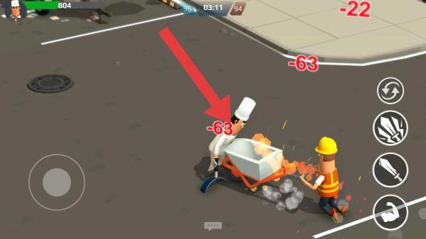 1、游戏中玩家操控角色抓捕僵尸,画面展示了角色在停车场的场景中互动,有攻击数值显示。