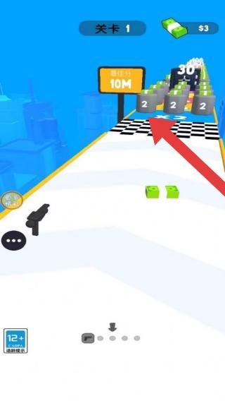 1、画面显示关卡1,有距离提示(10M)、金钱数值($3)等元素,游戏中玩家需在跑酷过程中收集物品、跨越障碍。