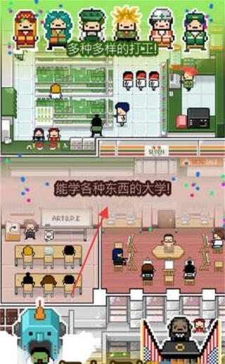 1、像素街机的复古生活美学:采用8-bit像素画风还原大学校园与出租屋场景,便利店的货架陈设、教室的课桌椅细节充满复古感,角色动作。