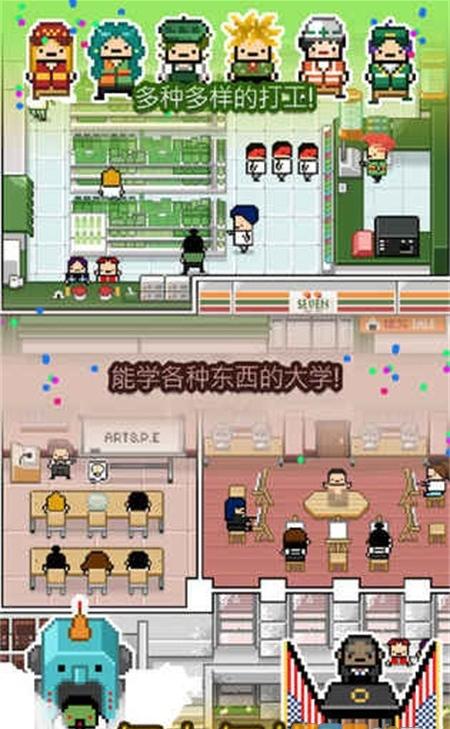 1、生存经营:扮演大学生,在像素城市里,平衡打工(如超市、餐厅)赚生活费。