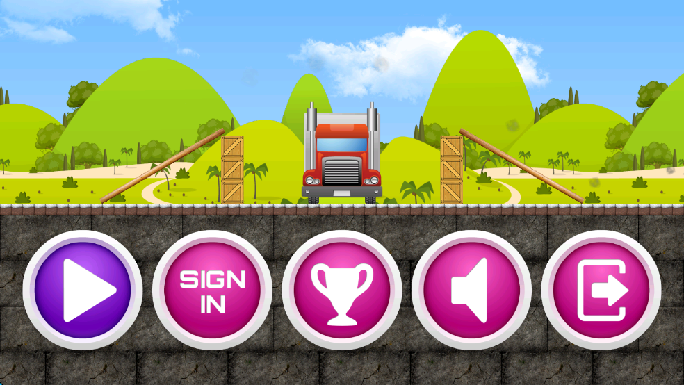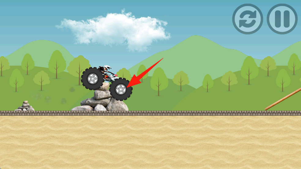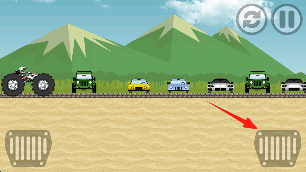 1、点击右侧踏板,驱动越野车前进,跨越石头等障碍,向终点车库行驶。