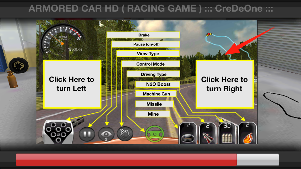 3、比赛中按提示操作,点击左右按钮转向,用武器道具,沿赛道完成任务。