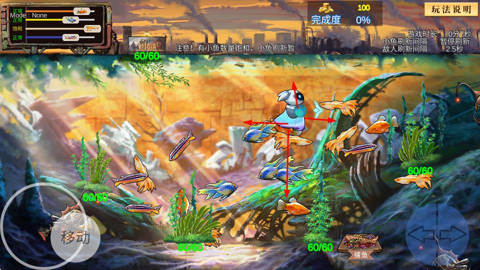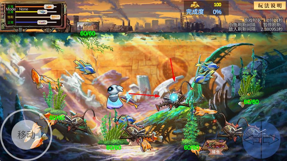 3、积累金币提升角色能力,关注完成度、生命条,应对小鱼数量饱和、敌人刷新,生存并推进关卡。