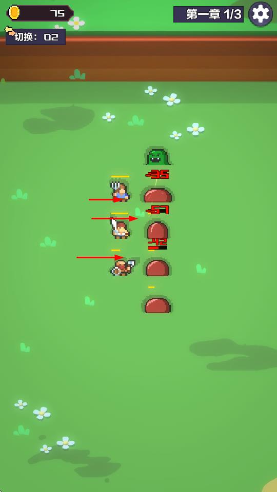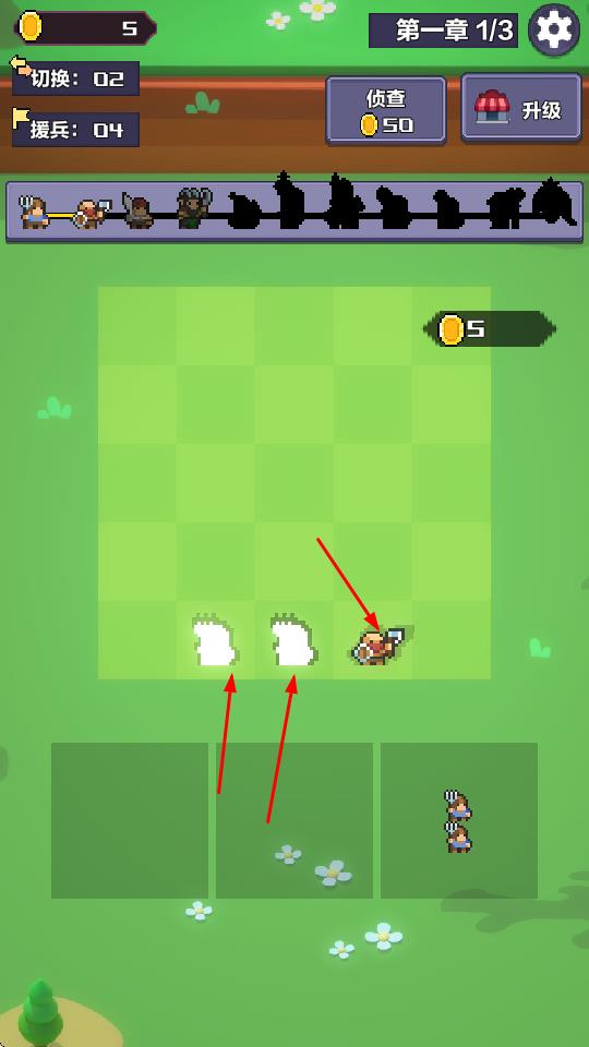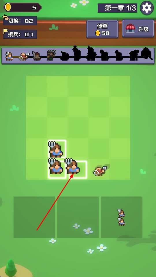 1、在关卡棋盘,消耗金币(5/75),点击空位部署像素部队(弓箭手、战士),组建阵容。