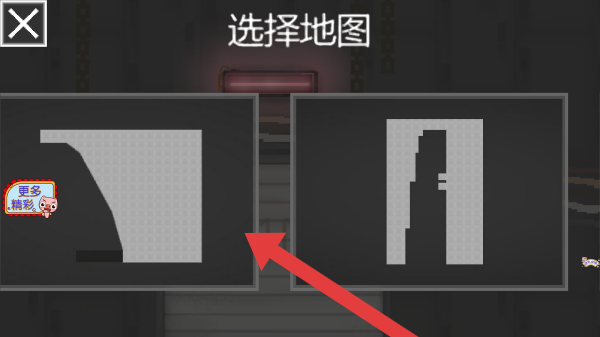 2、这是某像素风格“选择地图”的界面,玩家可以通过选择不同的地图来开始游戏,画面左侧还有“更多精彩”的广告标识。