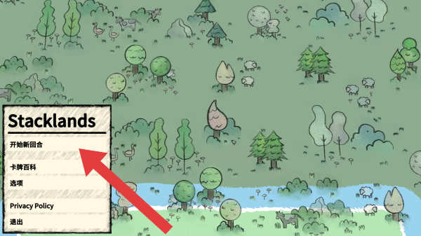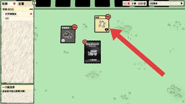 1、图中箭头指向【开始新回合】选项,玩家可通过该操作开启流程,在卡通风格的地图场景里,进行资源收集、卡牌组合等玩法,体验从荒野开拓到建设发展的过程。