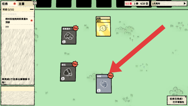 2、红色箭头所指的是“面包”卡牌,在这类卡牌是基础资源,可用于维持村民生存等,帮助玩家推进进程。