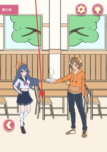 2、第23关食堂场景,分析男女角色互动需求,点击桌上物品或人物,尝试不同操作,推进恋爱剧情解锁关卡。