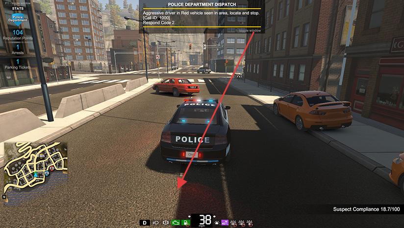 1、作为警察,接警后根据地图定位红色车辆,驾驶警车追击,保持安全车距,适时拦截,完成执法任务。