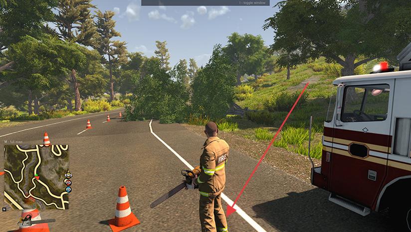 2、消防员接到道路清理任务,携带电锯抵达现场,锯断挡路树木,清理出通道,注意周边环境与操作安全。