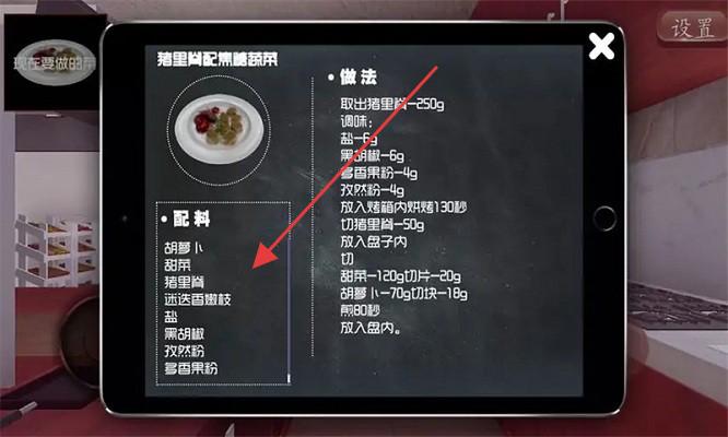 3、烹饪前查看菜谱(如第三图),备齐【胡萝卜、胡麻、猪里脊】等配料,严格按步骤操作,完成菜品制作。