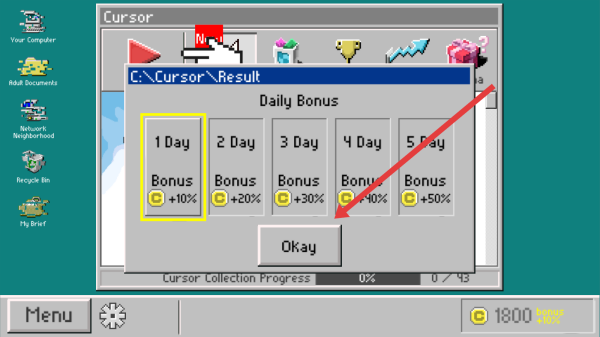 1、在“Daily-Bonus”界面,点击【Okay】,领取1-Day+10%等每日奖励,积累资源,助力光标收集。