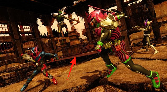 1、战斗中,观察场景内建筑(如【箭头】指向的破损结构),利用地形,指挥假面骑士走位、攻防,占据优势。