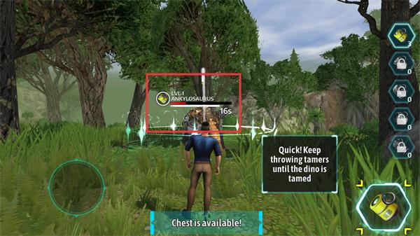 2、策略驯服恐龙:探索场景时遭遇野生恐龙,观察习性后使用诱饵、陷阱等道具策略驯服,将强力巨兽收为宠物,扩充战队。