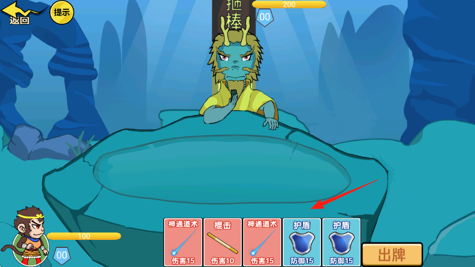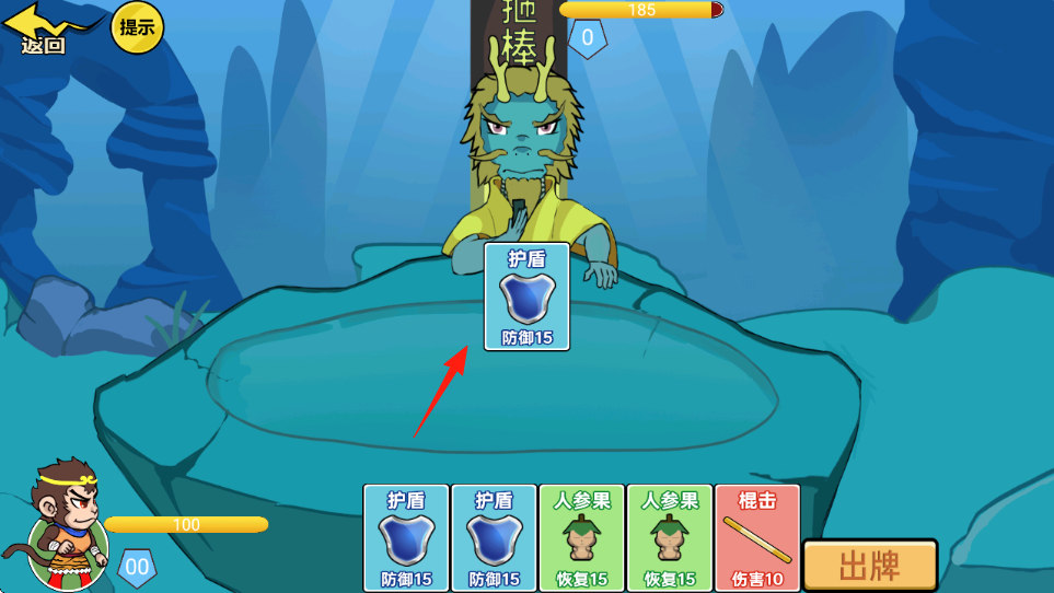 2、战斗时,选择【箭头】指向的“护盾”卡牌,点击出牌,为角色叠加防御,抵御龙王攻击。