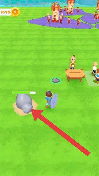 1、左上角显示金币数量为1695美元,画面中角色装备盾牌,红色箭头指向一个灰色物体,是资源或道具,远处还有城堡塔楼以及其他角色,在进行资源收集或任务相关的操作。