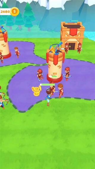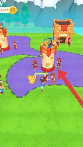 2、画面中有士兵、城堡塔楼,左上角显示拥有2680美元,红色箭头指向处似乎是士兵与塔楼附近的战斗场景。