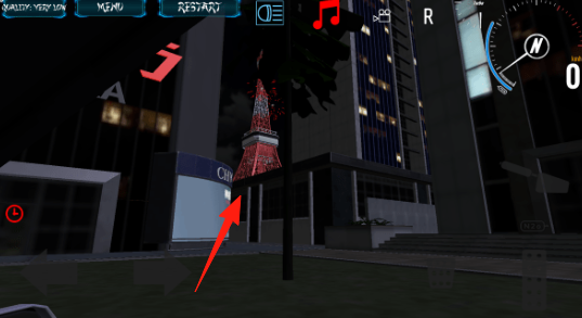 2、驾驶时,朝着【箭头】所指东京塔方向,在城市道路行驶,注意建筑躲避。