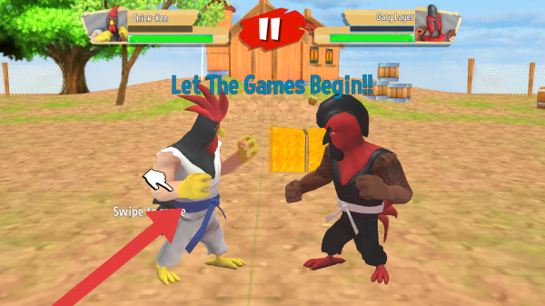 3、对战角色为Chick-Ken(左)和GengiLaya(右),画面有“LetTheGamesBegin!!(游戏开始!!)”等文字,提示“Swipetomove(滑动移动)”,呈现格斗对战初始场景。