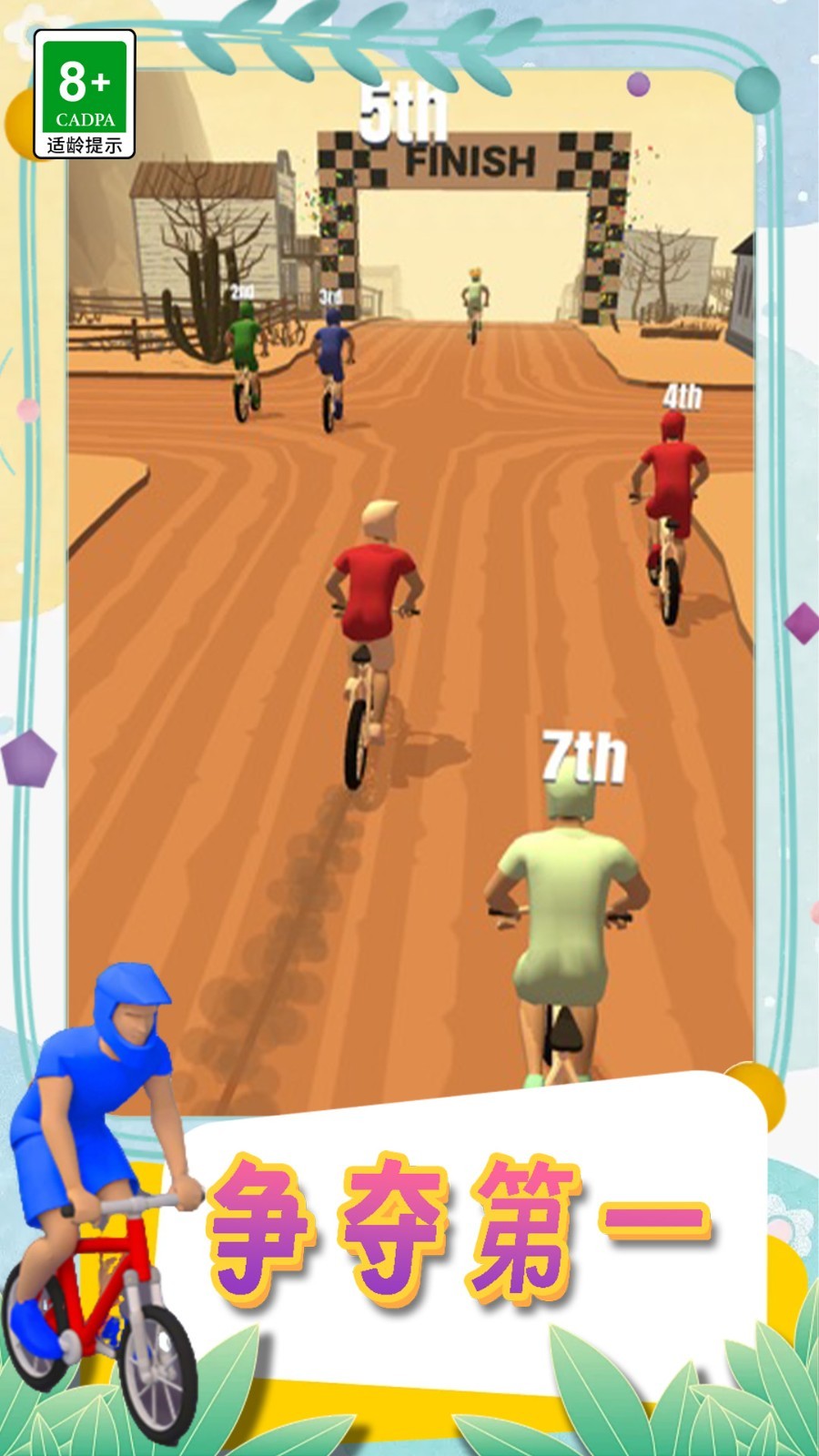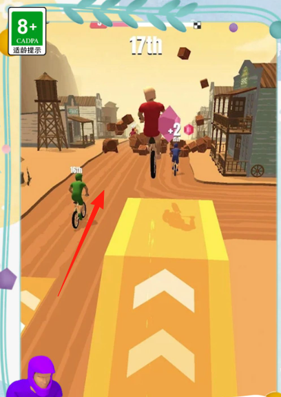 2、到西部小镇赛道,引导角色沿【箭头】方向骑行,避开障碍,追上前方穿红衣的选手。